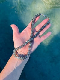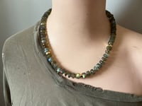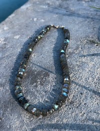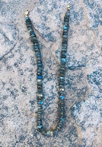 A simple strand of gorgeous, extra chunky labradorite with gold beads. From pale green to beautiful blues, these stones are stunning and feel really light on the neck.