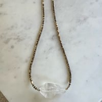 Mini pyrite squared beads with a 1" horizontally drilled top shelf Tibetan quartz.