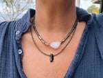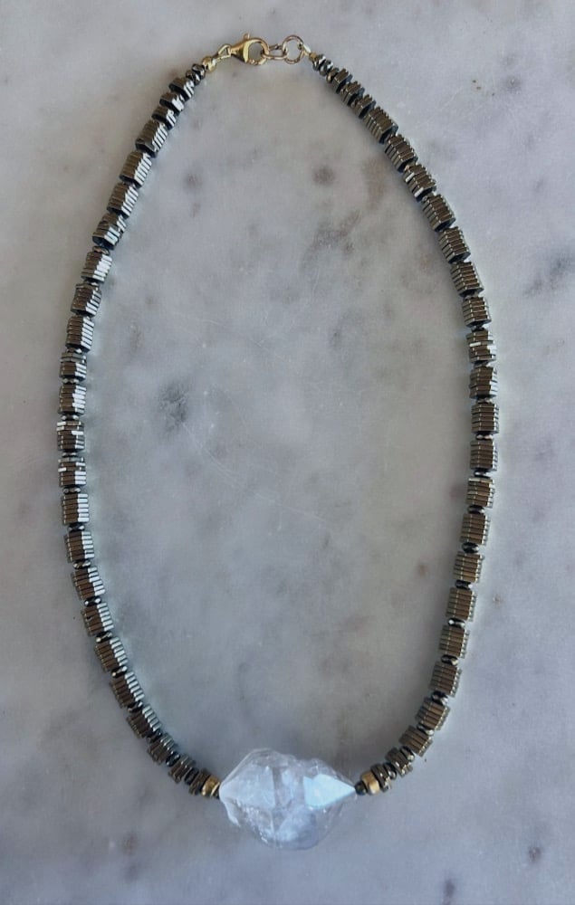 Pyrite is great for attracting money and also offers protection vibes. 22k gold findings. The crystal has rainbows in it and is top shelf quality. The naturally double-terminated shape adds to the balancing power of this crystal.
